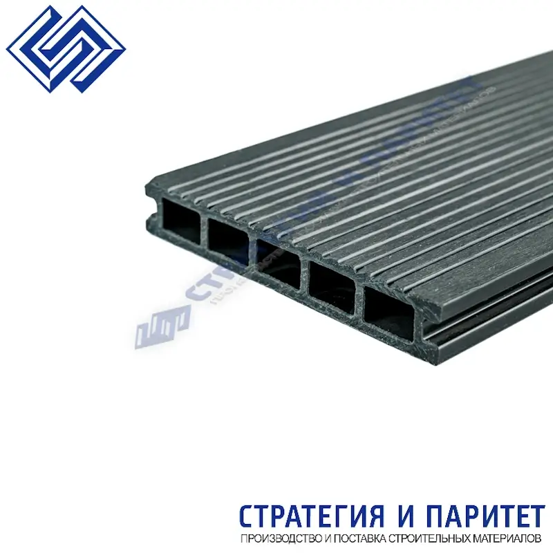Доска террасная из МПК пустотелая с пазом 3000х150х24 ГРАФИТ (3D Тиснение под дерево + Вельвет) - современный материал из уникального по характеристикам минерально-полимерного композита (МПК) для долговечной эксплуатации на открытом воздухе (до 30 лет).